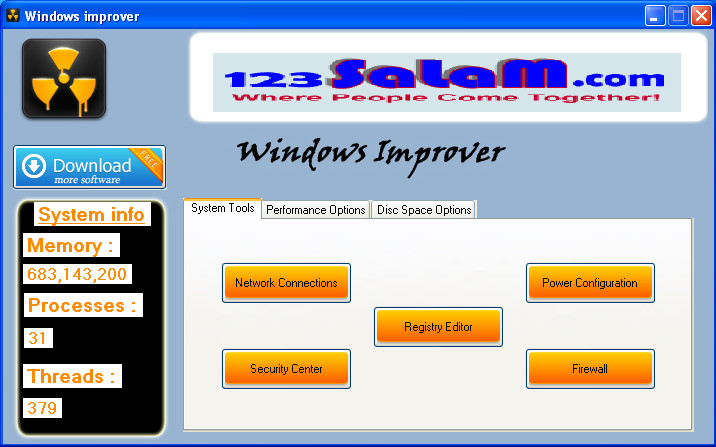 Windows Improver combines three different system utilities into one application, system maintenance, performance boosting and disk junk removal. Each one of these three system improvement avenues has several different tools. Tools which are not native to Windows Improver but they are rather just links to Windows tools who’s existence many people are not even aware of and those who start using Windows Improver will be surprised when they find out how much they can improve Windows performance without installing any kind of third party utilities.
