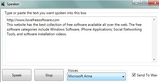 Interface of this freeware is quite simple and there are only two main buttons available; to listen to entered text and stop it. You can write or simply copy paste text to its interface and Click on Speak button to listen. Other than this, its unique ‘Send To Wav option’ is present at bottom middle part. This option will let you save audio for added text at desired destination location. For saving the audio, simply click on Check box present in front of this option to enable it.
