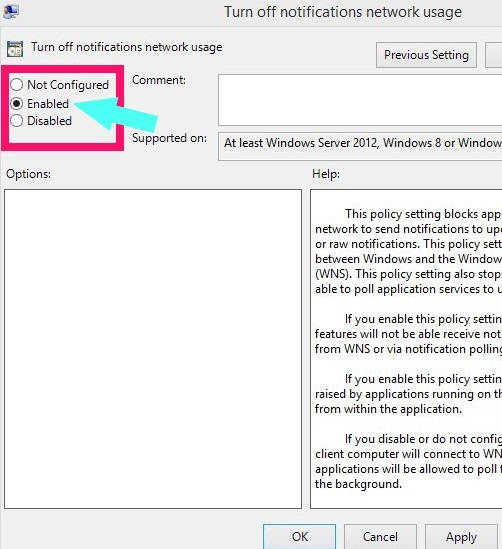In new popped window, click on the radio button that says “Enabled” (Yes, to disable toast notification, you need to click on enabled).