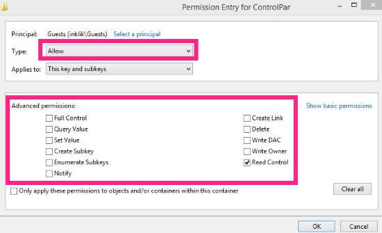 Choose a type in the next window: Allow or Deny. Then check relevant boxes to grant various permissions or to restrict the particular user/group for accessing Control Panel.