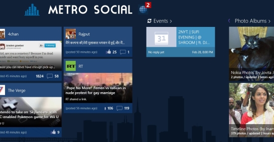 In total this app provides you with a fun and fresh interface in which you can interact with Facebook on your Windows 8 device. Download Metro Social from here. Also try out Feed for Facebook.