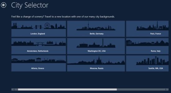 This Facebook app for Windows 8 allows you to change the background of the interface according to your needs. The app provides you with a set of pre-defined background of famous cities skylines. To use this open up the option menu and click on the set background button which is located on the upper right corner of the screen. This will bring up the window as shown below from where you can set the background of your choice.