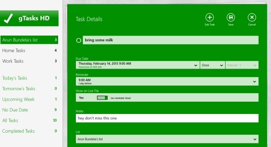 gTasks HD is an amazing task manager for Windows 8 that has the ability to sync with the Google Tasks. This is simply the best free Google Tasks App For Windows 8.