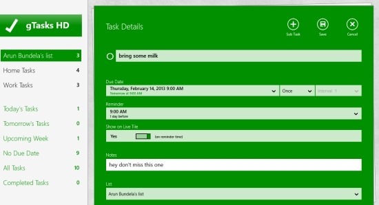 Features of gTasks HD a free Google Tasks app for Windows 8:
