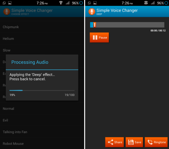 To apply an effect of your choice to the recorded audio, simply tap on an effect and Simple Voice Changer will start processing the voice as seen below. After a few seconds of processing, the audio will start will start playing with the effect that you chose in the interface. From here, you can save, share, and use the audio clip as your ringtone.
