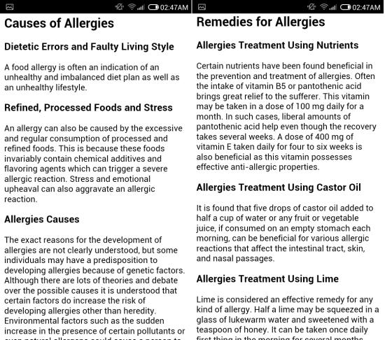 Scrolling further will reveal causes of allergies and then you will have remedies of allergies as seen below. Here you can see that the app provides multiple solutions for health issues. The remedies are all natural and easy to follow.