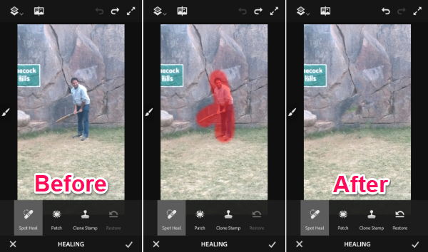 Adobe Photoshop Fix is probably one of the apps for Android to remove unwanted objects from photos. It comes with a simple interface and is very easy to use. You can simply open up this app and then create a new project by selecting a photo from which you want to remove any object. When you do that, the editor will open and you would need to select the “Healing” option at the bottom. Now, choose the “Spot Heal” option and then highlight the object on the photo for removal. You can manually adjust the brush size and hardness. Once done, all you gotta do is wait and it will automatically remove the highlighted object from the photo.