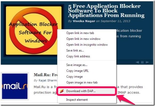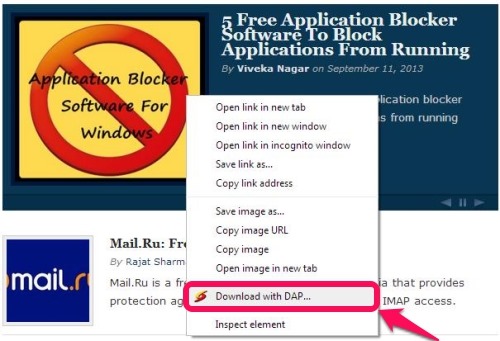 Download Accelerator Plus (DAP) is a free download manager extension for Chrome that lets you download files from Chrome, and offers you powerful downloading experience. This download manager Chrome extension offers you secure downloading along with fast download speed. It provides you various options and tools which you can use to download any item from any webpage. All you have to do is, simply right-click on the desired file that you wish to download and download it by selecting “Download with DAP” option. This extension requires Download Accelerator Plus application to be installed on your system.