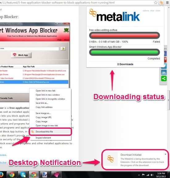 Metalink Downloader is a free download manager extension for Chrome that facilitates you to customize your download. This free download manager provides you desktop notification on the completion of download. You can also check the downloading status by clicking on the icon located next to the address bar. It offers you various options using which you can save the destination of the downloaded file, set the number downloads per server, set the number of files that can be downloaded at a time, and lets you choose the chunk size as well. All you have to do is simply select the file and using your context menu, choose the option of “Download this file”. Install this quick and free download manager for Chrome to speed up your downloading.