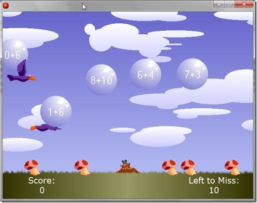 Bubble Sums is easy to use and play. Just choose addition or subtraction, and use mix it up using your keyboard keys. Random questions will be flying in the form of bubbles and kids have to type in the answers using the numeric keys on the keyboard. If the answer is wrong you have to try again. This lightweight Math game can customized and played with both keyboard and mouse. Only limitation is that kids can learn only subtraction and addition with this game; but it is useful for kids who are starters to Maths.