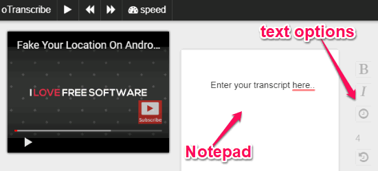 oTranscribe is actually a free online video transcription website which can also be used to add notes to YouTube videos. You can open and play any YouTube video just by entering the URL. It lets you add unlimited notes and also assign timestamps to each line or paragraph. The notes can also be shared by exporting them first as HTML, text, or OTR files. If you want to see any specific part of the video carefully, then it also has an option to control the playback speed.
