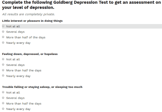 Short Depression Test is online depression test based on Goldberg Depression Questionnaire. It is almost similar to the first tool in this list, but has more questions. Here, you will have to answer 18 questions, which will help you determine if you have depression. After giving the test, you will get a score. There is a score key which you can refer to see what category you fall in.