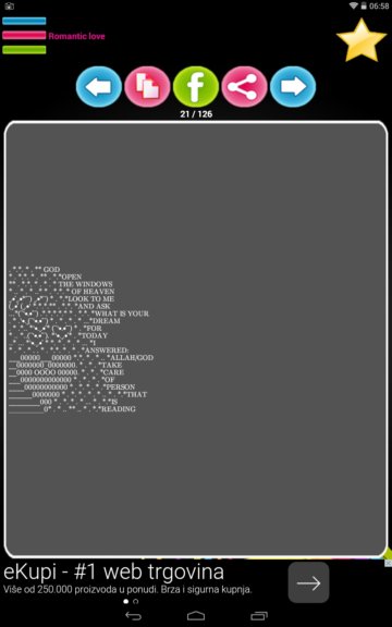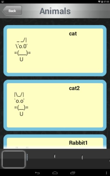 As you can see from the image above, the app has a mix of over 120 different pieces of ASCII art. They are grouped into 22 categories (nature, funny, love, greetings, etc.). Built-in gallery makes it easy to browse, preview and share the ASCII art. You can copy/paste it or share directly from the app using the share buttons.