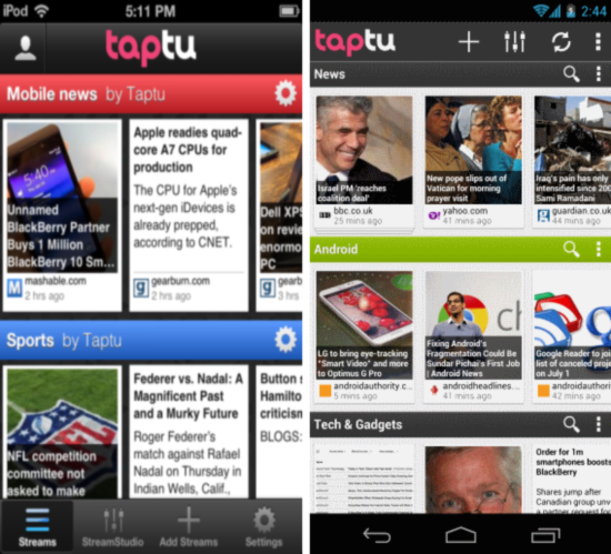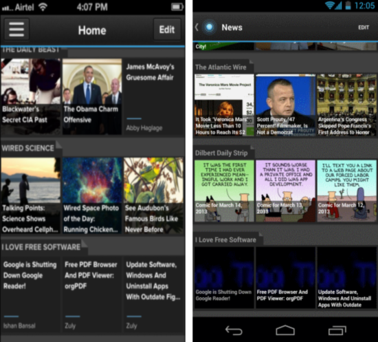 Pulse News is one of the most well known news reader app for most of the popular mobile platforms. This was one of the first apps that displayed the RSS content in a beautiful interface. The app offers you the ability to create an account, so that you can keep save all the RSS news feeds in the app. The best part about this service is that it also has a web page just like Google reader, so anything you read on the desktop will automatically be synced to the app and vise versa. The RSS items are laid out in horizontally scrolling strip that makes reading experience fun, if you think that Flipboard is too fancy then Pulse News is just for you and is a perfect Google Reader alternative for Android/iOS.