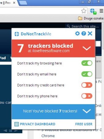 These numbers are of course the number of tracking cookies that the extension prevented from inhabiting your PC. Again if you’re interested in allowing a certain cookie, just click on the “Don’t track my browsing here” option and change the red X for a green check mark on the right, just like we did with Ghostery. That way the selected cookie is whitelisted and becomes functional. Notice that DoNotTrackMe also protects you email, credit card and phone information, it doesn’t just prevent websites from tracking you.