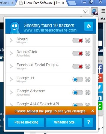 Clicking on the top right corner icon will reveal Ghostery’s control panel. Once you open up a website in this control panel you’re gonna see a list of all the trackers that the website tried to place on your PC. Clicking on the blue button next to tracker name will block the selected tracker for good. Button all the way to the right creates an exception and allows the selected tracker to be active, if you want to allow a certain tracker to keep tracking you.