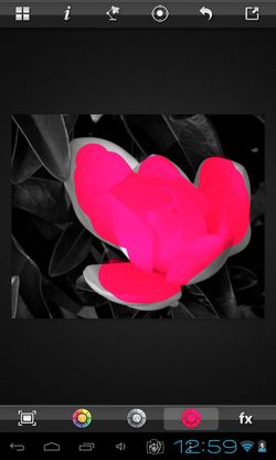 Photos can be added to the editor either from the gallery, or by creating a new photo using the camera. Color splash effect is applied the same way as before, by screen swiping on the object that you want to “color splash”. Use top and bottom toolbars to add effects, export the image, etc.