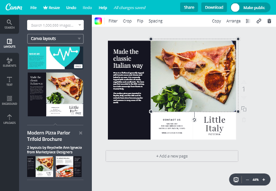 Desygner is one of the best free online Adobe InDesign alternatives that you can use. The free plan of this service is very good to create flyers, posters, banners, menus, business cards, magazines, social media assets like Pinterest board, Facebook cover, LinkedIn banner, wedding cards, greeting cards, social media posts, and so many others. Here it offers you an intuitive editor where you can create your design and use the huge library of the free stock images that you can use. Also, you can access so many vector graphics for your design along with fancy fonts. Here it lets you create your own library as well in which you can add logos, fonts, and images that will be frequently needed in your designs. When you are finished with your design, you can download it. Or, it also allows you to share your design using a URL.