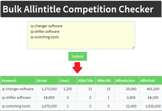 Bulk Allintitle Competition Checker is one of the best free tool that you can try to check keyword competition easily. It takes a list of keywords from you and then show you the keyword competition data. In the output, it generally shows the parameters like broad, exact, Allintitle, Allinurl, AllInAnchor, and AllInText like details. You can see how many times the input keyword occurs on web and then you can save the report that it generates. It allows you to export the list of keywords with competition data to an Excel file easily. And you can use the tool anytime you want as there’s no restriction on the number of times you can use this tool.