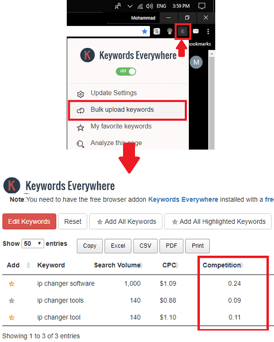 You can install this extension for your browser using the above link. And to make it work, you will have to sign up for a free API key. After getting the key, you can start using it. To use it for bulk exploring keywords, simply click on its icon and then use “Bulk upload keywords” option. After that, paste the list of keywords on its interface and hit “Get Metrics” button. It will get you the keyword data including the competition stats. You can see the competition rate corresponding to each keyword in the dedicated “Competition” column.