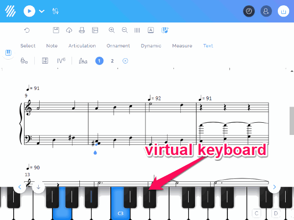 You can also enable a virtual keyboard on the editor to easily add notes to the sheet music.