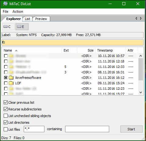 - Explorer tab: In this tab, select your desired folder whose structure you want to list and check the options: Clear previous list, Recurse subdirectories, List directories.