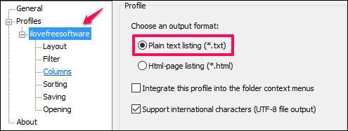 Filelister is very simple software to create a list all the folders and sub folders in a specified location. It can output the listed folder structure in text file or in an HTML file format. It’s pretty simple to use this freeware, you just have to create a profile with any name and then set some filters and options to make it list only folders. You have to customize it as following: