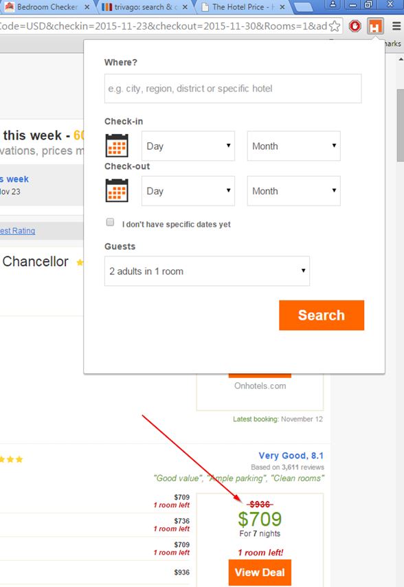 Filtered “deal search” results will display only those listings that currently have special deals and promotions active. Some of the listings I checked reported price drops as high as couple hundred dollars per night. Extension adds a search tool to the top right corner of the Chromes interface, see image above.