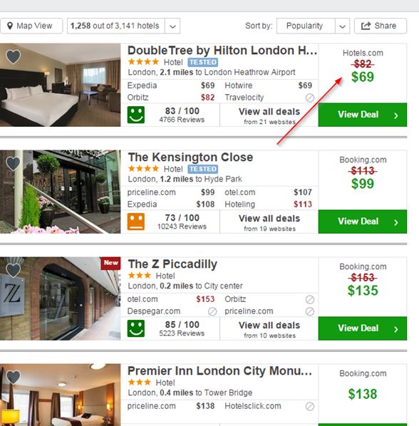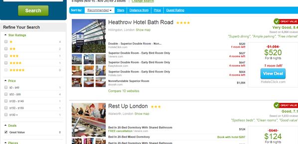This is another web app that will give you quick access to the online tool offered by trivago. Once you’re there, searches can be made and results will have deals listed right away, alongside the originating website where the hotel listing is located, see image above.
