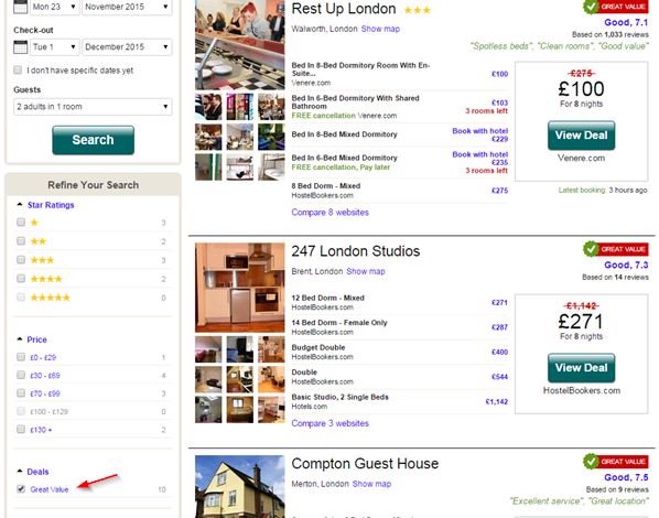 What’s interesting about this extension is the “Great Value” option in the bottom left corner. Ticking this option will filter results for the selected location so that only results with currently active deals and discounts are showed. Notice the crossed out price. This way you can catch lots of cheap booking listings with relatively affordable prices.