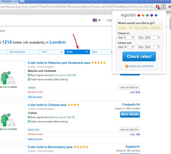 Hotel Deals is a hotel discount extension, a web app actually, that fetches listings from all the more popular websites like Booking.com, Hotels.com, and many more, including Agoda.