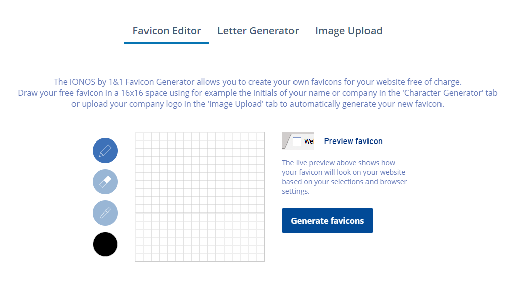 The Ionos by 1&1 is a simple Favicon generating web application that helps you create a favicon using three methods. These include Favicon editor which lets you draw your favicon, the Letter Generator which helps you convert your typed letter into a favicon, and the Image Favicon which helps you generate the favicon using an image.