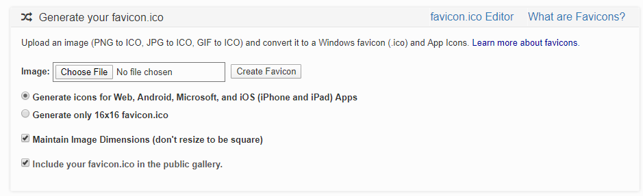 Favic-o-matic lets you either create the ICO format of the image straight away. Else, you can also choose the option of generating the favicon for all kinds of browsers if you are unsure of the format. The website is simple to use and you can access the options from the homepage itself. Just upload the image choose one of the two options: Just convert it in .ico format or generate the favicon for every website.