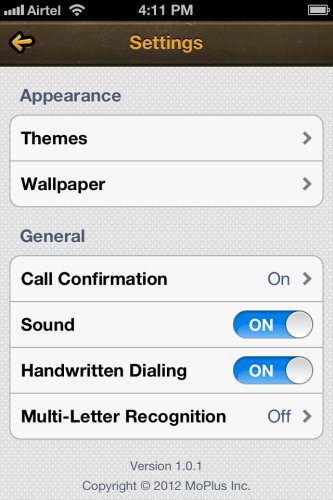 Color Phone Free is a iPhone app which offers you better dial pad with gesture support and themes. This free app offers nice looking themes for iPhone dial pad. Along with this it even allows you to search contacts through handwriting. You can also choose and change wallpapers from the given ones. It also shows you call logs and your favorite contacts.