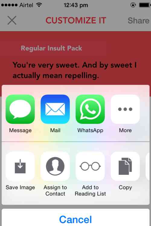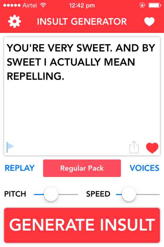 The box in which the insult is generated has a flag option on the left hand side corner. In case you find the joke offensive than you can flag it. On the right hand side of the display box is a heart icon to favorite an insult along with an icon for sharing the insult with your friends through Mail, message or Whatsapp.