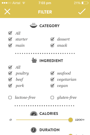 The funnel type icon at the top right side of the screen is for choosing filters for the recipes you want. You can see a screenshot of this below. You can choose category like all, starter, main, dessert, snack. Then you can choose the type of ingredients like seafood, vegetarian, vegan, pork, beef, poultry or all. Apart from this you can also choose lactose-free or gluten-free recipes. Also, choose how many calories you want in your recipe by adjusting the slider that is provided. Similarly, you can also choose the time duration of cooking by adjusting the slider.