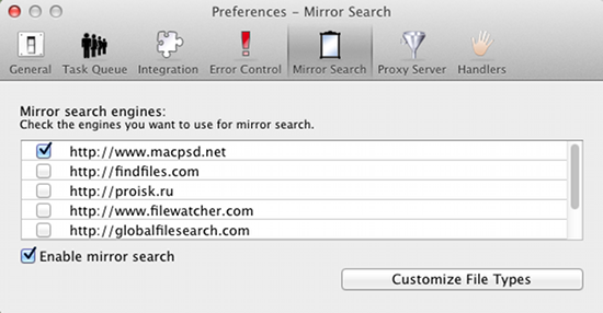 This free download manager for Mac is able to search for Mirrors of the files that are being downloaded. You can also decide from where progressive downloader searches for the mirror links, by going in the preferences and  navigating to the Mirror Search tab as seen below in the screen shot.