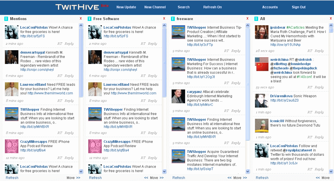 TwitHive is completely AJAX based, so your channel data keeps on refreshing itself without a need to submit your window. The refresh frequency also seems to be pretty quick. Each channel also has an option of one click on demand refresh. So, you can easily do a quick refresh as well if you want to see latest data.