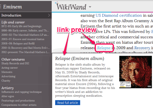 WikiWand is an online tool that helps to get modern interface for Wikipedia. It makes reading articles on Wikipedia more interesting and convenient. It doesn’t change content of Wikipedia, but it provides better visual appearance than traditional Wikipedia interface. Moreover, contents box is also placed on left side. You can even hide the content box to read article with more space.