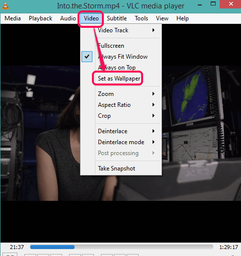 Step 4: Now repeat Method 1: open a video file–> Video menu–> Set as Wallpaper. That’s it. Your video should start playing on your desktop screen.