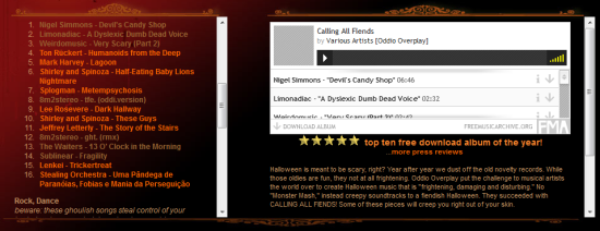 OddioOverplay has a very nice online collection of Halloween tracks. The webpage has two frames. The one in left includes the list and other in right displays the available track. A hint for you is to scroll down the iframe in the left and click on album links (by default those links will not be visible to you). Now, the panel to the right with an embedded-audio-player can be utilized to play the track. To download mp3, you will need to click on the associated downward arrow in audio-player. No extra hassle is required for Downloading free Halloween music at OddioOverplay. For more details Click here.