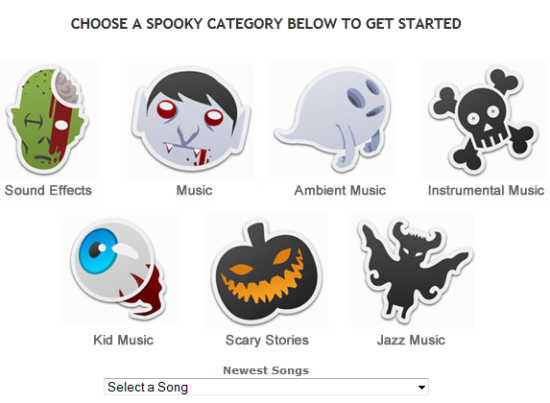 SpookySoundTrack has a devoted section for free Halloween music. There, you will find hundreds of free online tracks placed in different categories like sound effects, kid music, music, ambient music, instrumental and more.