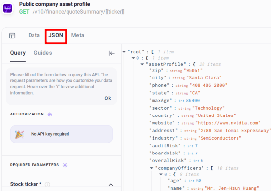 Databar provides a free company information API to get address, city, country, industry, sector, risk profile and other details about any company. All you have to do, specify its stick ticker as an input to get more details. There is no authentication or anything like that required in order to use it. Also, you don’t really have to use a browser or HTTP client to make an API request.
