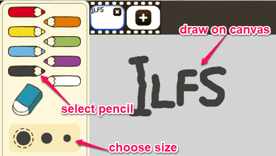 To start drawing, simply click on any of the pencils and then choose the size of the pencil. There are three different sizes available for each pencil. After that, you can start drawing anything you want on the canvas, as shown below.