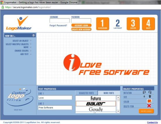 Logomaker is free logo designing web application that helps you to design attractive and meaningful logo for your office card, school project or any other reason. The application is free to use and completely web based, thus you need not waste time in downloading application or sign ups. Use this free application to design your logo and you can put it on anything from business cards and stationery to websites, shirts, hats, pens, and more. Moreover this freeware let’s you create and save up to six different logo designs—all for free.