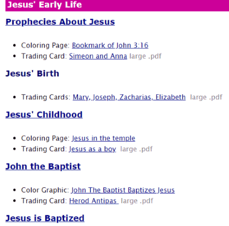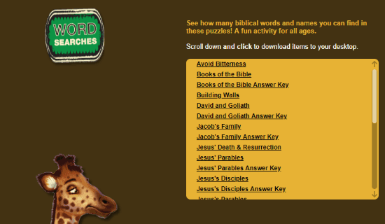 Here, each testament covers a few lessons of the Bible. In the new testament, there are topics like Jesus’s early life, parables, works, early church, etc. If you want to read the lessons by topics then you will get to read about the bible with detailed chapters. The site offers worksheet for every lesson. You can take prints of them.