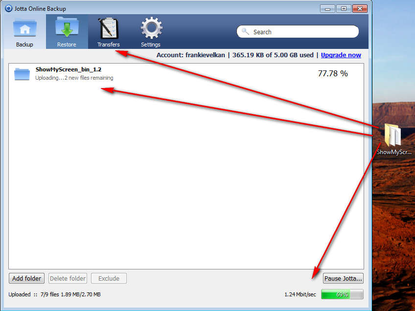 On the image above you can see image upload in progress. You can add several folders at once, and they are all gonna be uploaded, how fast depends on your internet connection. In the lower right corner notice that there’s an upload bar where you can see how much time you have left. The same thing can be seen in the Transfers tab, only there you can also see the status of the download, which can be started in the Restore tab.