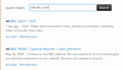 So you have a favorite website or blog which you want to follow all the time and stay updated, but don’t know its RSS feed. No problem, simply search for it using the tool by entering the search query as site:websiteurl. For example: “site:bbc.com”, “site:hindustantimes.com”, etc..