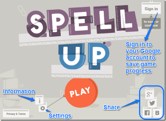 As evinced by the above screenshot, Spell Up features a pretty simplistic UI. The top right corner lets you sign-in to your Google account. Although Spell Up can be played without logging in just fine, you need to log in if you want to save your game progress. The bottom right corner features shortcuts to share the game on popular social networks, while the bottom left has shortcuts for general game information and settings, where you can change options like voice settings, keyboard controls etc..