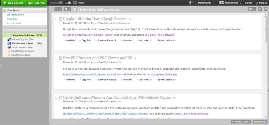 Next is NetVibes, another free web reader that lets you subscribe to RSS Feeds from different Web Pages and Blogs. It offers a Google Reader like interface and acts more like a social-media dashboard app with its iGoogle-style widget.
